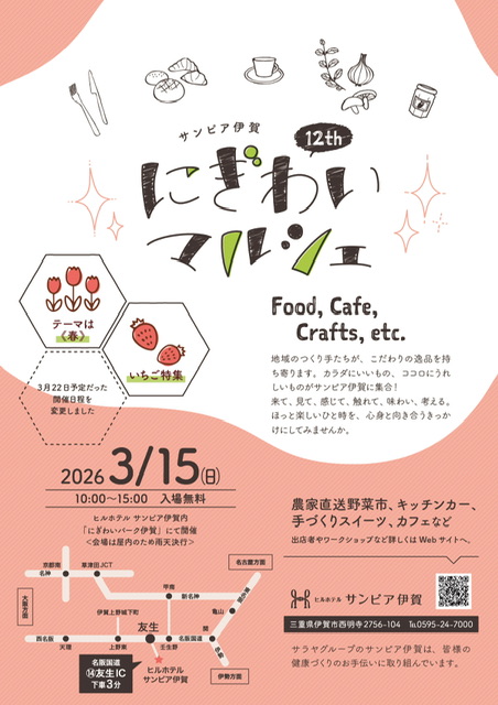 3月15日(日曜日)はサンピアさんでにぎわいマルシェ出店!ワークショップはカラーサンド寄せ☺️ 他の出店者さんのフードメニューはいちご満載!遊びにきてね☺️